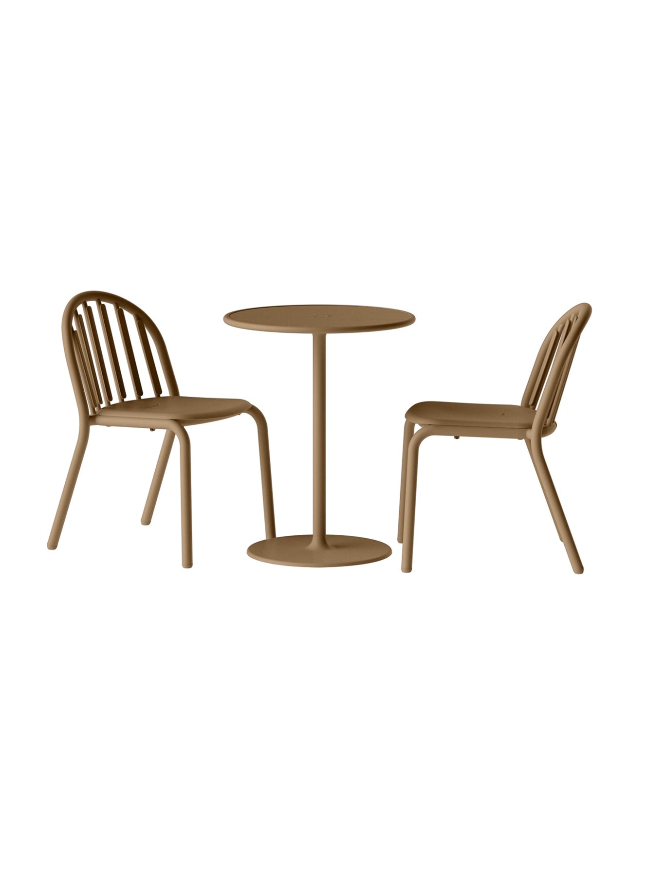 La table est complétée par deux chaises Fred's, fabriquées en aluminium léger et résistant aux intempéries. Leur design ergonomique se caractérise par une assise incurvée et des lattes de dossier plates pour plus de confort, ainsi que par une ouverture unique en forme de sourire pour un drainage rapide après la pluie. Les chaises sont également empilables, ce qui facilite leur rangement.